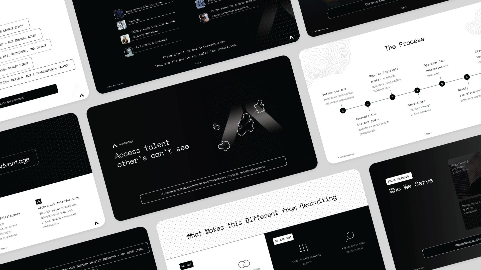 Archipelago is an elite human capital and talent-access network built by operators, investors, and domain experts. The platform connects leadership teams with the invisible talent market: proven operators and rising leaders who are not actively searching and cannot be reached through traditional recruiting channels.